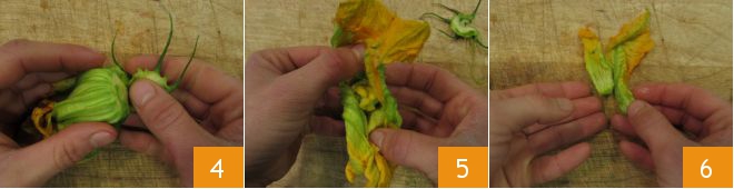 Clean the zucchini flowers, then remove the leaves at the base 4 and the internal pistils 5. Then cut them into strips 6.