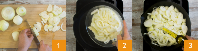 To make the flatbread with Taleggio and caramelized onions, first clean the onions, then slice them to a thickness of about 1/8 inch 1. In a pan, heat the onions 2 with a drizzle of oil 3.