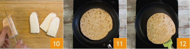 Cut the Taleggio into slices about 1/5 inch thick 10. Heat the whole-grain flatbread in a pan for about 30 seconds 11, flip the flatbread 12 to heat it for another 30 seconds.