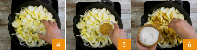 Add water 4, brown sugar 5, and adjust with salt 6.