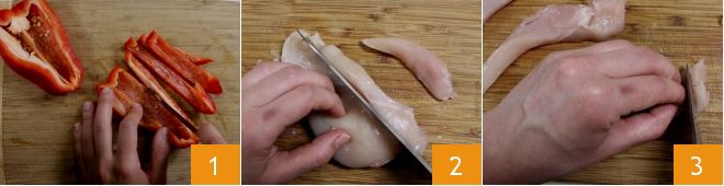 To prepare the flatbreads with paprika chicken and red peppers, start with the peppers. Wash them under cold running water, then remove the cap and cut them in half. Take the amount needed for the recipe, remove the seeds, and first cut them into strips 1, then into thin sticks about 1.5 inches long each. Gather them in a bowl. Meanwhile, take the chicken breast, remove the fattier parts if necessary, and cut it into strips 2, then divide them further 3.