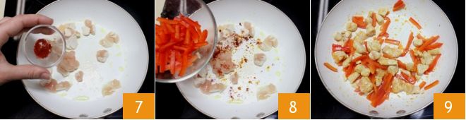 Add the sweet paprika (or hot, if you prefer) to the chicken 7 and then the pepper pieces that you set aside 8. Stir and cook over medium heat for 15 minutes 9, stirring the ingredients often and, if needed, adding a bit of water to aid cooking.
