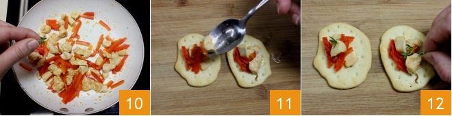 When cooking is complete, crumble the fresh thyme leaves by hand into the pan 10 and turn off the heat. Let the paprika chicken with peppers cool slightly, then start assembling your flatbreads: use a teaspoon to fill each flatbread 11 and, if you like, you can add a few more thyme leaves 12. Serve your flatbreads with paprika chicken and red peppers as a tasty finger food!