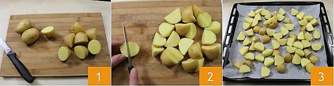 To prepare the Reblochon fondue, start by cutting the new potatoes with the skin into four parts (1-2) to obtain wedges. Line a baking tray with parchment paper, place the potato wedges on the tray 3,