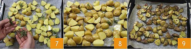 and finally, scent the wedges with fresh rosemary 7. Now the potatoes prepared this way 8 are ready to be baked in the oven for 15 minutes at 392°F (200°C) in a preheated static mode oven. Bake the potatoes until they are golden and have formed a light crust on the surface 9.