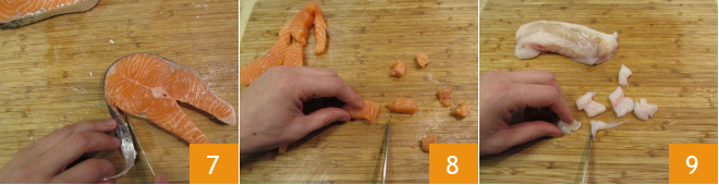 Now move on to the salmon: remove the skin 7 and cut into chunks 8. Do the same with the monkfish 9.