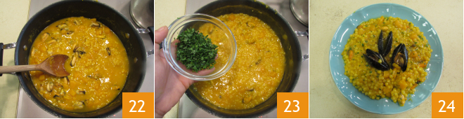 Stir 22 and flavor with chopped parsley 23. Serve the fregola with mussels and pumpkin, decorating with the whole mussels set aside 34!