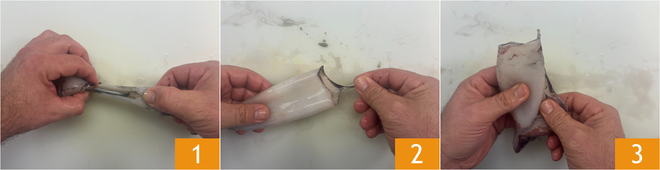 To prepare fregola with seafood, first focus on cleaning the squid. Rinse them under running water, separate the head with the tentacles from the mantle 1, and remove the cartilage pen from the mantle 2. Remove the skin from the mantle 3.