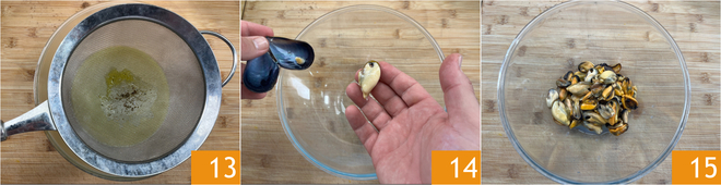 Transfer them to a bowl 19 and separate the meat from the shell 20, again keeping some shells aside for plating. Strain the clam cooking broth 21.