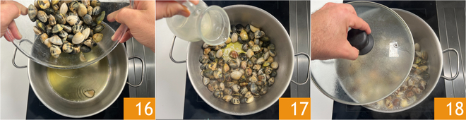 Now focus on How to clean clams. Soak the clams, ensure there are no dead or broken ones which could release sand, then rinse thoroughly. In a pot, pour the oil, add the garlic and let it sauté for a few minutes. Add the clams 16 and deglaze with white wine 17, let all the alcohol evaporate, and cover with a lid 18. Cook until the clams have opened.
