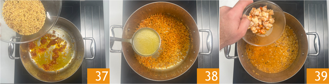 Add the fregola 37 and toast for 3 minutes. Pour 3 ladles of mussel and clam cooking broth into the pot 38, cook until the liquids are absorbed by the fregola. Then continue to add broth until the fregola is cooked, at this point add the shrimp 39.