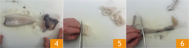 When the mantle is clean 4, rinse thoroughly both inside and outside. Then cut it into rings about 3/4 inch thick 5. Take the heads and separate the tentacles from the head by cutting just below the eyes 6.