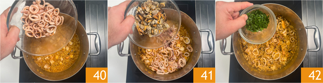 Add the squid 40, the mussels, and the clams 41. Finally, add the chopped parsley 42.