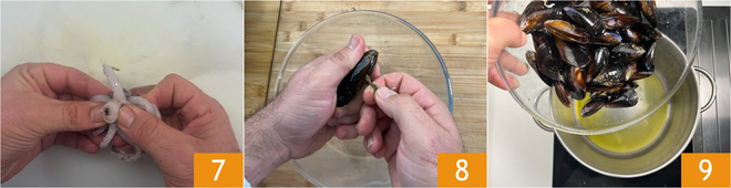 Open the tentacles outward and use your hands to push the central part, then remove the beak 7. Rinse under running water. Then focus on How to Clean and Open Mussels. Scrape the shell with the back of a knife or a scouring pad to remove all impurities. Then pull away the beard 8, rinse under running water until the water is clear. In a pot, heat the oil, then add the mussels 9 and stir.