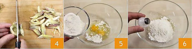 After cleaning the artichokes, proceed with the preparation of the batter: in a large bowl put the eggs, add the flour 5, the salt 6,