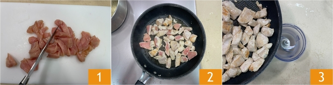 To prepare the fried chicken rolls with fruit and vegetable sauces, first cut the chicken breast into pieces 1. Sauté them in a nonstick skillet 2 for about ten minutes, seasoning with salt and pepper. Cook the chicken until done, then transfer the pieces to a food processor 3.