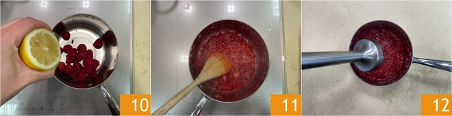 In the meantime prepare the various sauces. Start with the raspberry one. Put the raspberries in a small saucepan, add the lemon juice 10 and the water. Cook over medium heat for about 5 minutes, stirring often 11 until they break down. At this point blend with an immersion blender 12.