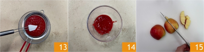 Strain the sauce through a sieve 13, then set it aside 14. Now prepare the apple sauces: wash the apples, remove the cores and cut them into cubes 15.