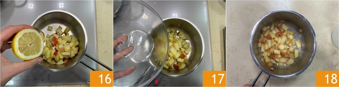 Add the lemon juice 16 and half of the water called for 17. Then cook them until they become soft 18, which will take about 10 minutes.