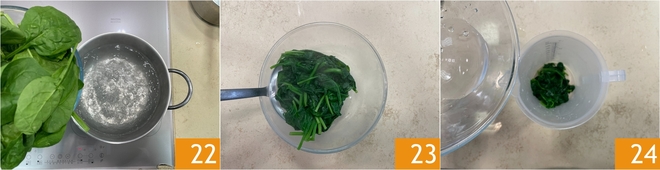 Blanch the spinach in salted water 22 for a few seconds. Drain and transfer them to ice water 23. Drain again, place in a tall, narrow container and add the water 34.