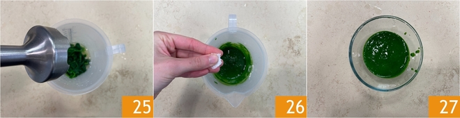 Blend with an immersion blender 25, adjust the salt 26 and the spinach sauce is ready as well 27.