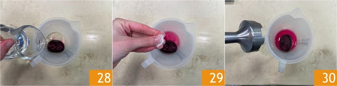 Prepare the last sauce. Place the beetroot in a tall, narrow container, add the water 28, the salt 29 and blend with an immersion blender 30. Set this one aside too.