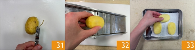 Move on to the potatoes. Peel them 31 and wash. Slice them thinly with a mandoline slicer to achieve a thickness of about 1/16 inch (a couple of mm) 32. Make 4 towers of 10 slices each and place them on a baking sheet lined with parchment paper 33.