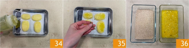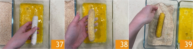 While the oil heats, bread the rolls. Dip them first in the egg 37, then in the breadcrumbs, then again in the egg and finally again in the breadcrumbs 39 to make a double breading.