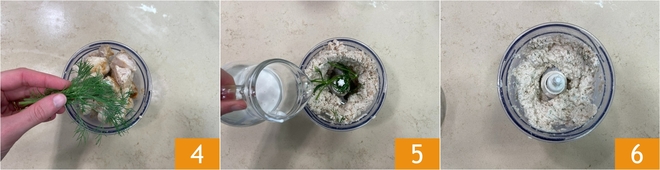Add the dill and blend well, then add the cream 5 and continue blending until you obtain a creamy, homogeneous mixture 6.