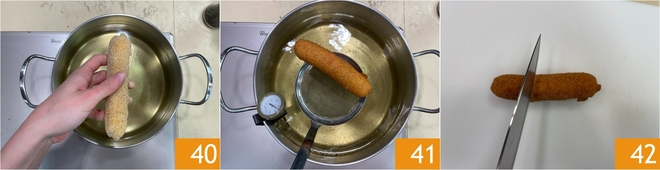 As soon as the oil has reached the correct temperature, immerse the first chicken cylinder 40. Fry until nicely golden; then drain 41 on a sheet of paper towel. Cut each cylinder into 3 rolls 42.