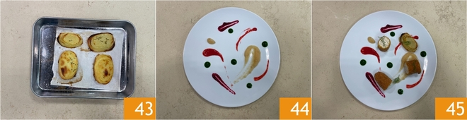 Also remove the now-cooked potatoes from the oven 43, then plate. Use the fruit and vegetable sauces to decorate the plate 44, then place the chicken rolls on top and garnish with sprigs of dill 45.