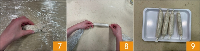 Using plastic wrap, form cylinders by rolling about 3.5 oz of the mixture in each one 7, tighten well, tie a knot on both ends 8, place them on a tray 9 and put them in the freezer for at least 1 hour (this step will help firm up the mixture so it's easier to bread).