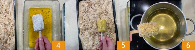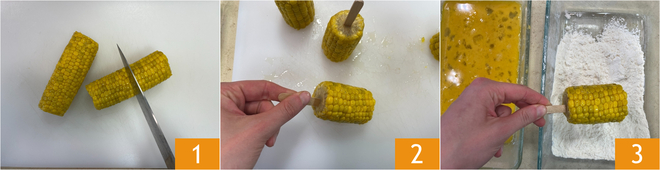 To prepare the fried corn on the cob, start with the corn cobs. We used pre-cooked ones, just cut them in half 1 and then stick them in the center with a skewer 2, like a popsicle stick. Use a meat tenderizer to help with this operation because the central part of the cobs is quite hard. Move on to the breading: first pass them in flour 3.