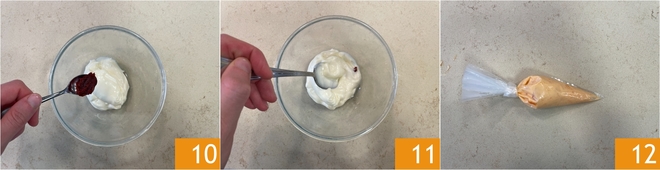 While you fry the corn cobs, you can prepare the spicy sauce: pour the mayonnaise into a bowl and add the chili paste 10. Mix and transfer to a pastry bag 12.