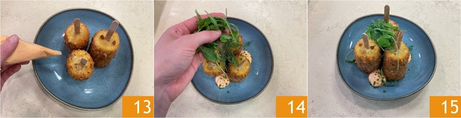 For plating, place the corn cobs with the stick upwards, squeeze dollops of chili mayonnaise 13 and garnish with arugula 14, dill, and chives. Your fried corn on the cobs are ready, enjoy them immediately 15!