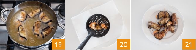 In a bowl, mix the breadcrumbs and flour 16, coat the rolls one by one in this mixture 17, then heat the oil for frying in a pan and, when it reaches 340°F, immerse a few rolls at a time 18.