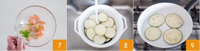 and wrap the eggplant slice around the shrimp 13 to create a roll 14. Secure it with a toothpick 15 and set aside.