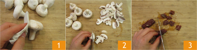 To prepare the fried eggs with mushrooms and tomatoes, start by cleaning the mushrooms: after cutting off the earthy part from the base, scrape the cap with a paper towel 1, or a damp cloth. Slice them thinly about a quarter of an inch 2. Also cut the sun-dried tomatoes, drained of their preserving oil, into 2-3 pieces 3.