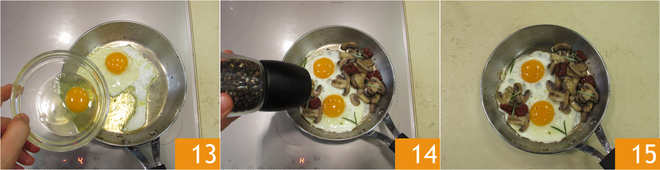 When everything is ready, cook the eggs: break two eggs into the skillet with the base 13, if you prefer, do it in a small bowl to avoid breaking the yolk. Cook for the time you think is right (about 3-4 minutes at most, just enough time for the whites to set and the yolk to remain creamy enough). Once the whites have set, add the garnish to the skillet, pepper 14, salt, and finally enjoy immediately the fried eggs with mushrooms and tomatoes, served with the toasted bread 15.