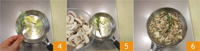 In a skillet with oil, heat the garlic and rosemary 4. Then add the mushrooms 5 and after a quick sauté, add salt, this way the water from the vegetables will be released. As soon as it has almost completely evaporated 6
