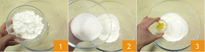 To make fried milk, pour the starch 1, sugar 2, and grated lemon zest 3 into a large bowl.