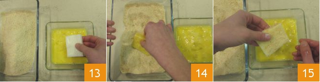 Dip each piece of cream first in the beaten eggs 13, then in the breadcrumbs 14, and then again in the eggs 15 and breadcrumbs for a double coating.