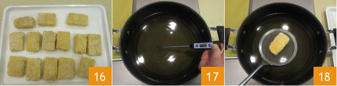 As you coat the bites, place them on a tray 16. Heat the oil in a pan, and when it reaches 340°F 17, immerse the bites 18. Cook a few at a time to avoid lowering the oil temperature; about 1 minute is enough.