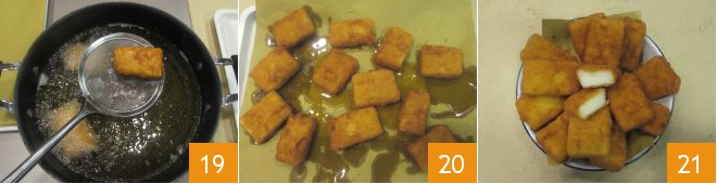 When the bites are golden, drain them 19 and let them dry on a tray lined with paper towels 20. Serve your fried milk hot 21.