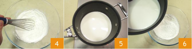 Mix these dry ingredients 4 and set aside. In a saucepan, heat the milk 5, and once it is near boiling, pour it into the bowl with the dry ingredients 6 gradually, stirring to avoid lumps.