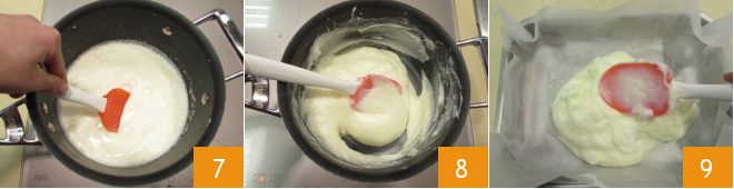 Return everything to the pot, place over low heat, and stir constantly with a spatula or wooden spoon 7. When you notice the cream starting to clump and thicken 8, turn off the heat and stir vigorously. The cream will become smooth again away from the heat source. It is important to use a wooden spoon or spatula rather than a whisk, as whisking might break up the cream, causing it to become watery and not properly thickened during cooling. Once ready, pour and spread the cream quickly into a rectangular baking dish about 10.34x7.48 inches, lined with parchment paper 9.