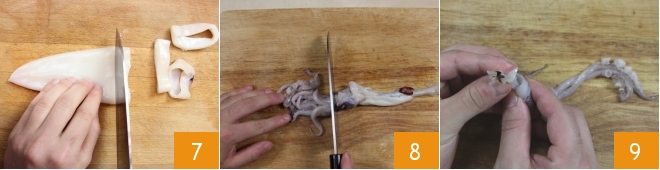 and cut the rest into rings 7. Take the tentacles and eliminate the eyes using a knife 8; then, pushing it out with your fingers, remove the beak found in the center of the tentacles 9. If the tentacles are too big, you can cut them in half.