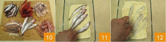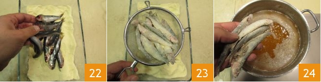 Next flour the anchovies 22 and remove the excess semolina 23. Immerse in oil 34.