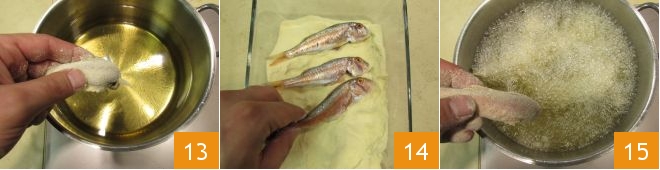 Remove the excess semolina and dip the fish one at a time in the boiling oil 13. Flour the goatfish 14 and fry them together with the cod 15.