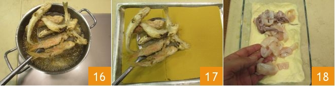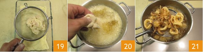Wait 3-4 minutes; when they are golden, drain them 16 and transfer them to a tray lined with oil-absorbing paper 17. Flour the calamari 18